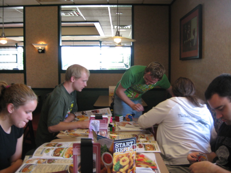 We had the award ceremony and after that most people left. A few of the older ones stuck around and helped me pack up and put some chairs away. Like last year, we then went to Denny's for dinner (they have really good lighting and they seem tolerant of our antics). We discussed cubing, the upcoming Nationals. Jake popped his Megaminx during dinner and I guess the piece ended up going under the cushion, which Jake then removed the seat and dug under there to find it. Apparantly it was extremely gross, but I didn't press anyone for details.